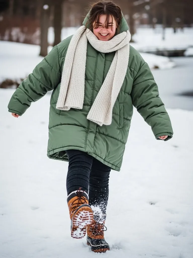 This outfit is all about staying warm while having the absolute best time in the snow. The oversized green puffer jacket brings that soft marshmallow vibe in the cutest way and the quilted fabric looks super comfy. Paired with a chunky cream knit scarf that adds instant coziness and a little bit of contrast, the whole look feels winter ready without trying too hard. The black ribbed leggings keep everything sleek underneath while those sturdy tan snow boots make the outfit practical for icy paths and playful moments in the snow.