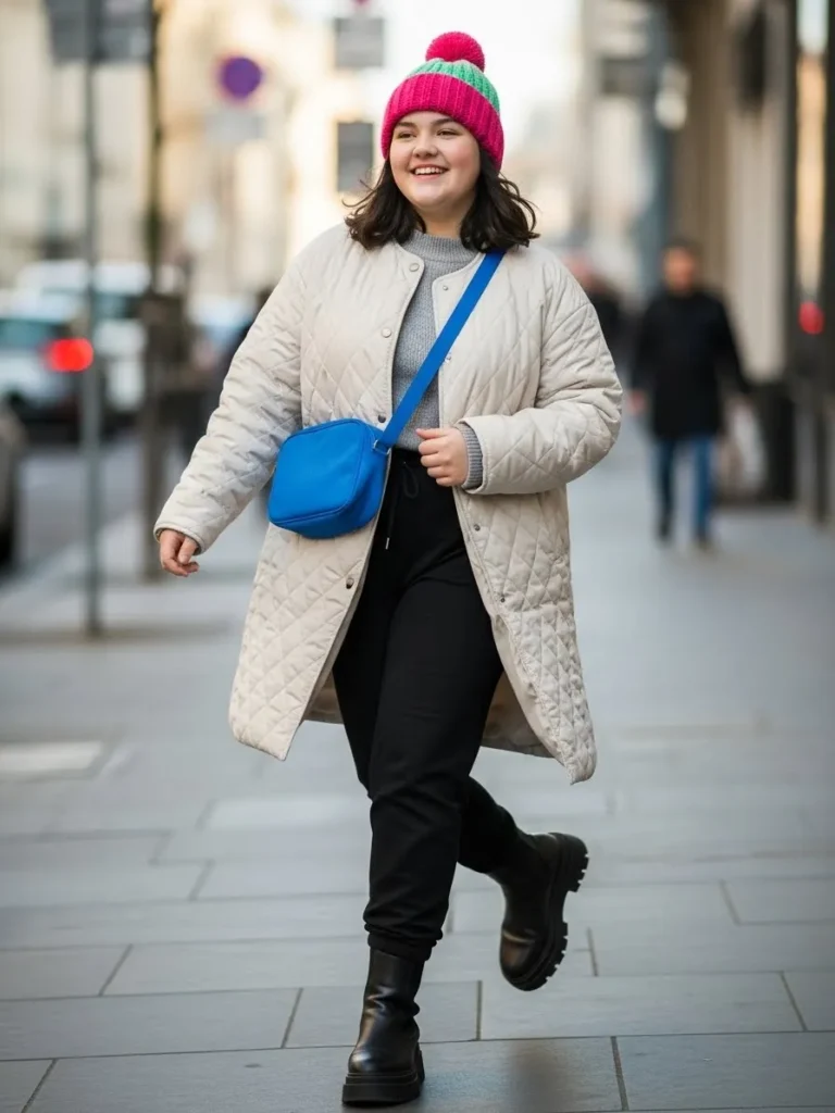 This outfit brings together the cutest mix of cozy and cheerful style. The cream quilted coat has that soft winter texture that feels warm without looking bulky. Underneath, the light gray sweater adds a simple neutral layer that pairs so well with the black joggers. The chunky black boots give the whole look a little edge which balances the softness perfectly. The bright knit beanie in hot pink and green instantly grabs attention in the happiest way and the bold blue crossbody bag adds another fun pop of color. Everything feels playful and practical which is such a great combo for cold weather.