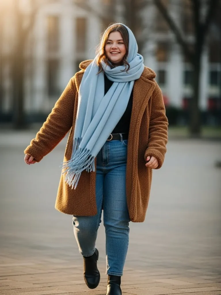 This look is all about warm textures and easy winter charm. The teen model is wearing a plush caramel teddy coat that adds instant softness to the whole outfit. Underneath is a simple black top tucked into medium wash skinny jeans that create a clean and balanced silhouette. The oversized icy blue scarf adds a gorgeous pop of cool color and looks so snuggly that you can almost feel it through the screen. Black ankle boots finish the outfit with a sleek touch that keeps everything grounded and polished.