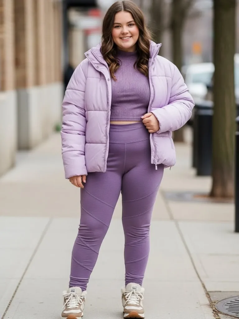 This outfit is the sweetest winter match made in comfy heaven. The cropped lilac knit top pairs perfectly with the high waisted purple leggings that hug in all the right places, giving the whole look a soft and streamlined feel. The puffer jacket brings in that plush winter warmth while keeping the color story beautifully monochrome. The sneakers add a sporty finish that keeps everything relaxed and easy to wear, making the whole outfit feel fun and youthful while still totally practical for cold days.