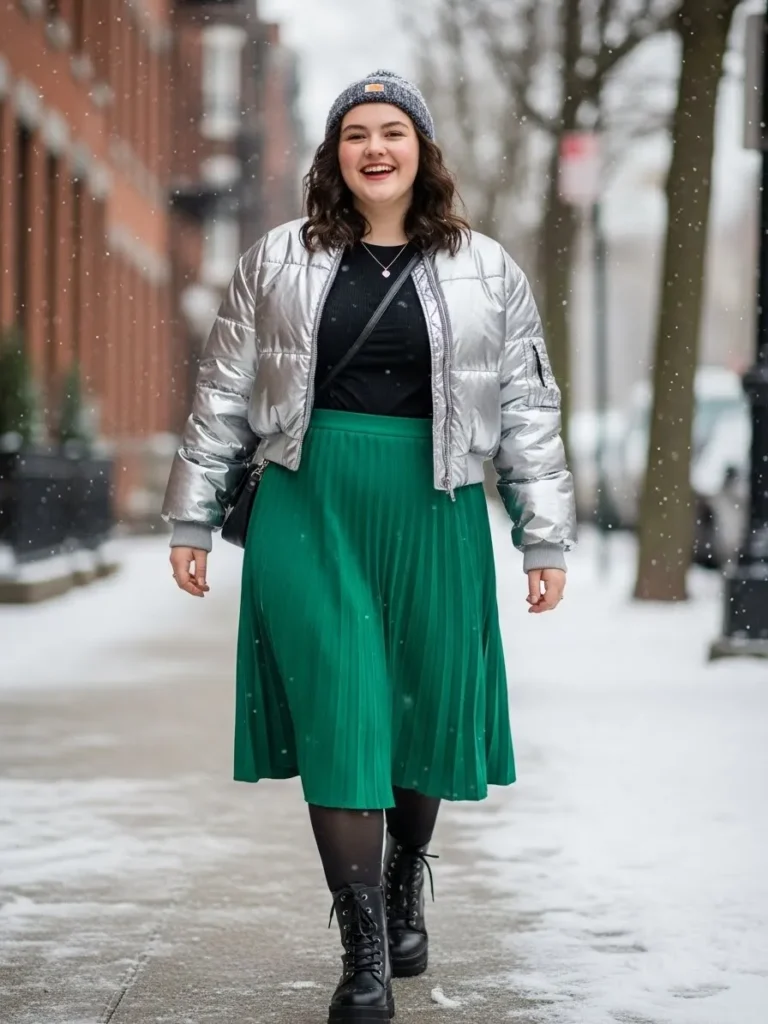 This outfit mixes winter comfort with a fun bold vibe. The metallic silver puffer jacket instantly stands out and gives that cool street style feel. Underneath she keeps it simple with a black top and a crossbody bag that adds an easy practical touch. The star of the look is the bright green pleated skirt that moves beautifully and adds such a pretty contrast against the snowy background. Black tights and lace up combat boots ground everything and make it totally winter ready. A soft gray knit beanie finishes the look with a cute laid back feel.