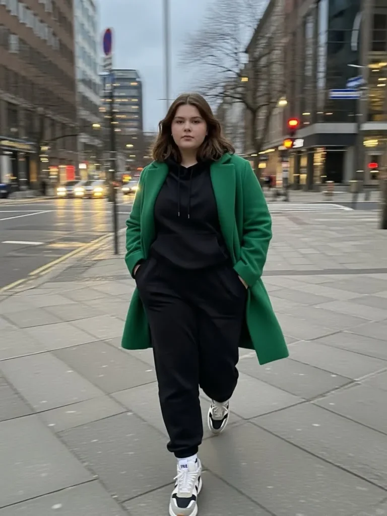 This outfit mixes casual comfort with a bold pop of color in the best way. The look starts with a sleek black hoodie paired with matching black joggers that keep everything relaxed and warm. On top sits a vibrant green coat that instantly brightens up the whole outfit and adds a polished layer without feeling too serious. Chunky white and gray sneakers keep the vibe sporty and practical for busy winter days. The overall feel is cozy, modern, and effortlessly confident.