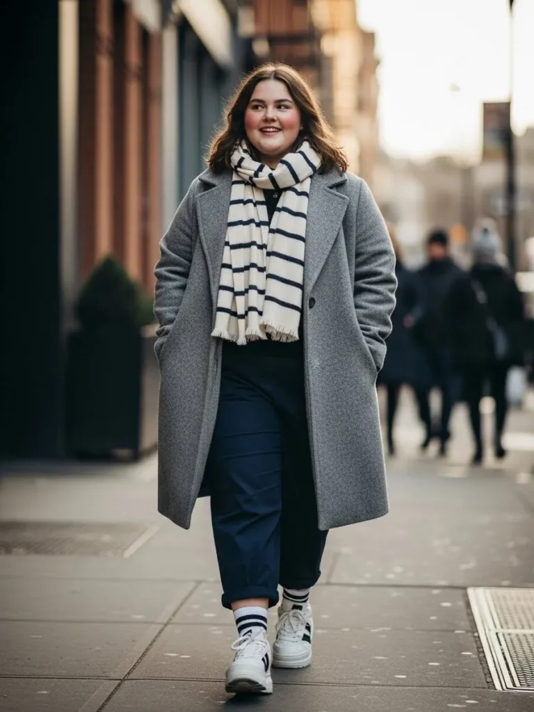 This outfit mixes cozy street style with a polished winter vibe. The soft grey wool coat feels classic and warm while the striped cream scarf adds a fun bit of personality. The navy trousers keep things clean and simple and the cuffed hem looks so cute with the chunky white sneakers. The whole look has that effortless walking-through-the-city energy that feels comfy but still totally put together.