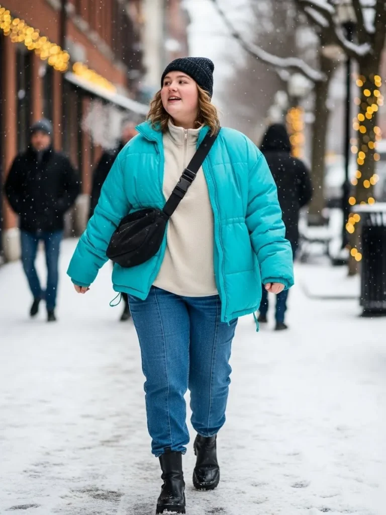 This outfit brings all the cheerful winter vibes with a bold turquoise puffer jacket that instantly pops against the snowy backdrop. She pairs it with a soft cream zip pullover that looks warm and easy to layer, plus classic blue jeans that keep the look grounded and practical. The black knit beanie and matching crossbody bag add a cute street-style touch, while the chunky black winter boots make the whole outfit feel sturdy and ready for icy sidewalks. Everything works together to create a fun, colorful, teen friendly winter look that feels casual and confident.