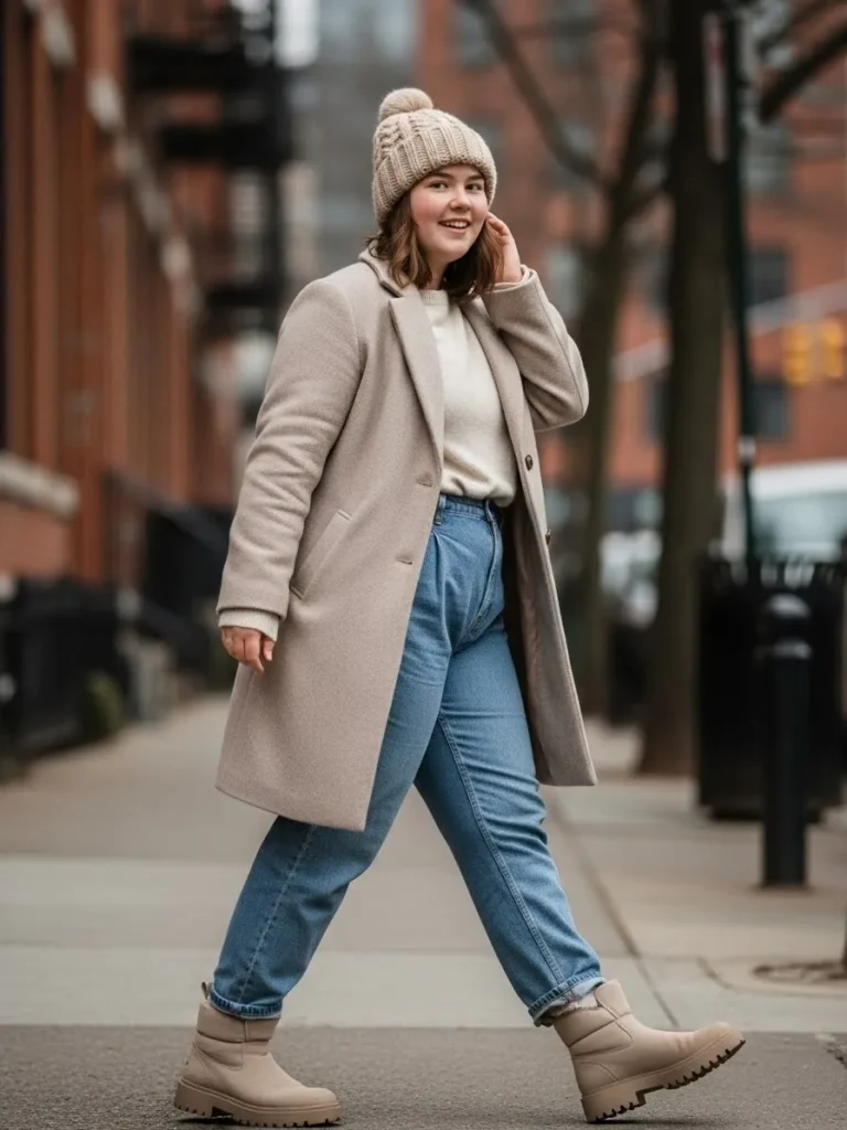 This outfit brings together all the soft neutrals that make winter dressing feel extra cute. The teen plus size fit features a warm oatmeal knit beanie with a chunky texture, a cream sweater that looks perfectly cozy, and a long beige coat that instantly elevates the whole look without trying too hard. The high waisted light wash jeans add a relaxed vibe, and the beige winter boots with sturdy soles tie everything together in the most effortless way. The whole outfit feels calm, comfy, and city ready with that easy walking-around energy you get on a chilly day.