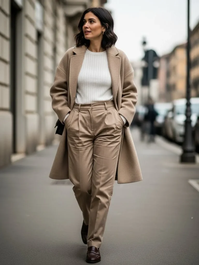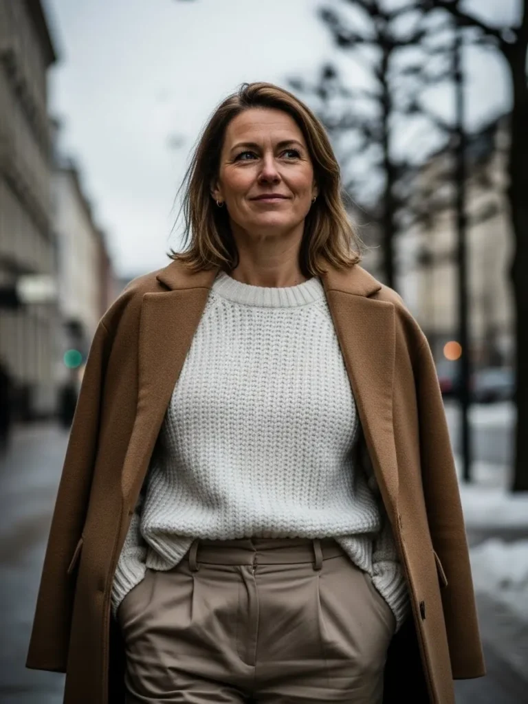 This look features a warm camel coat layered over a chunky white knit sweater and neutral tailored trousers. The textures work beautifully together and give the outfit depth while staying within a soft color palette. The overall vibe feels timeless and effortlessly chic.