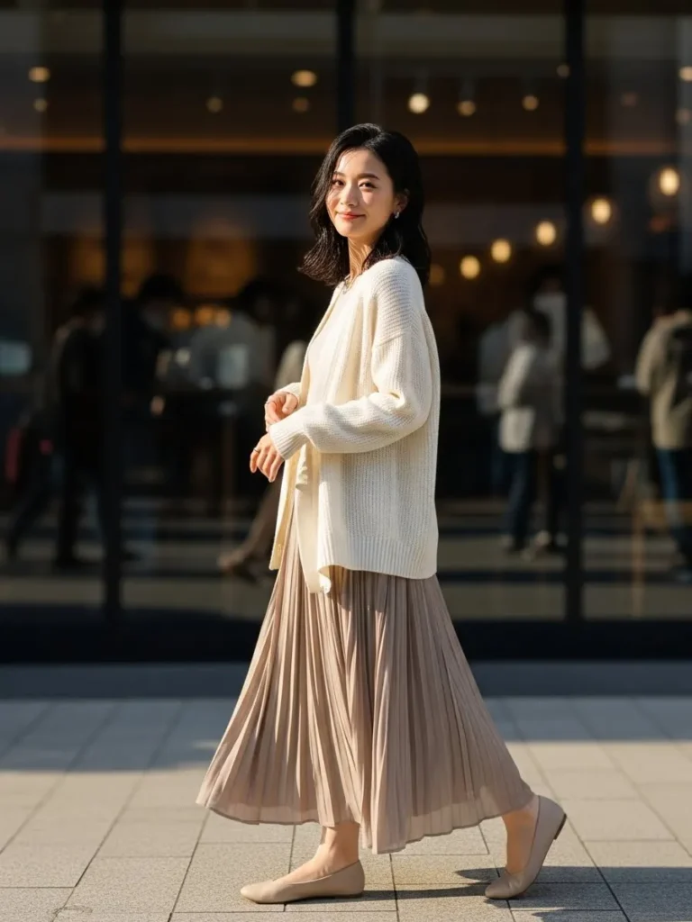 This outfit pairs a soft cream sweater with a flowy pleated midi skirt in a light neutral tone. The fabrics feel light and comfortable, with gentle movement in the skirt that adds an elegant touch. Simple flats keep the look grounded and easy, making it feel relaxed but still polished.