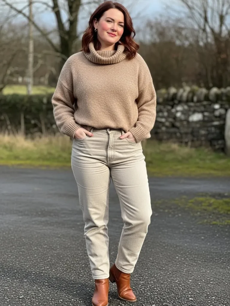 This outfit is all about comfort with a polished twist, featuring a soft beige knit sweater paired with light neutral jeans. The fit feels relaxed, and the warm brown boots add just the right amount of contrast. Everything feels casual but thoughtfully put together.