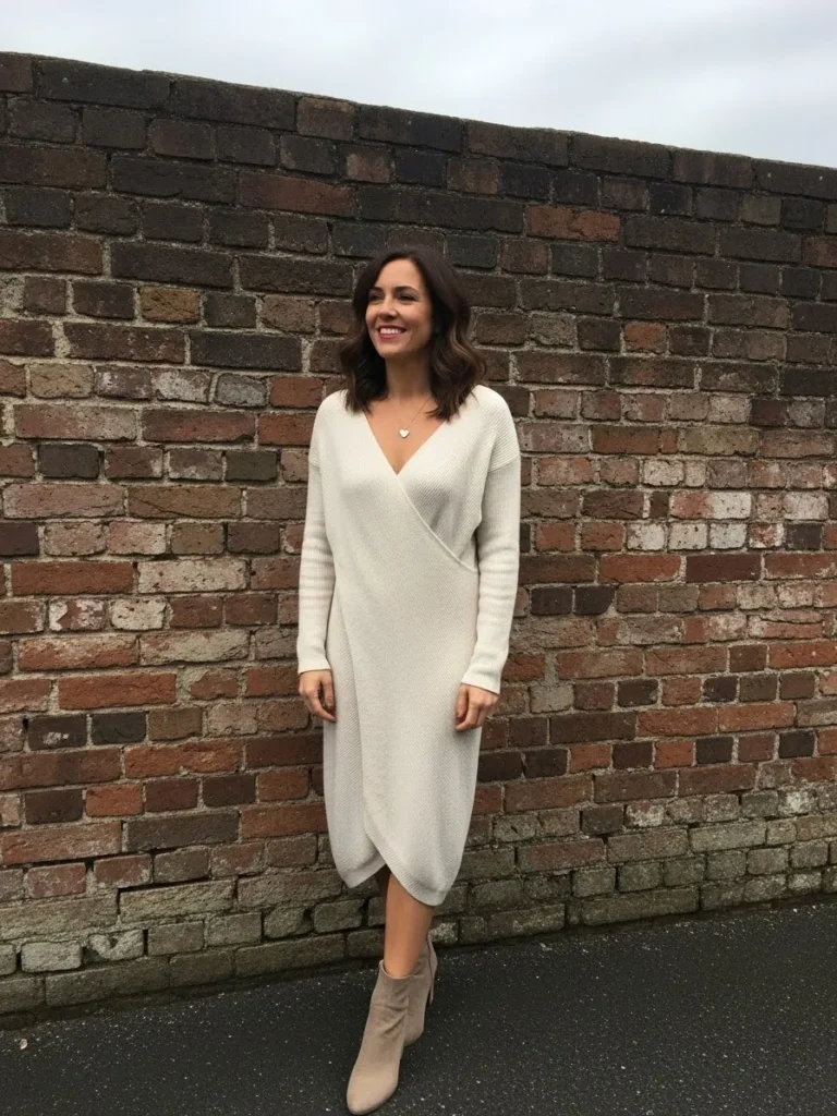 This outfit features a simple neutral midi dress with a soft drape that flatters the body beautifully. The clean lines and understated color keep it elegant and versatile. Neutral boots complete the look with a subtle modern touch.