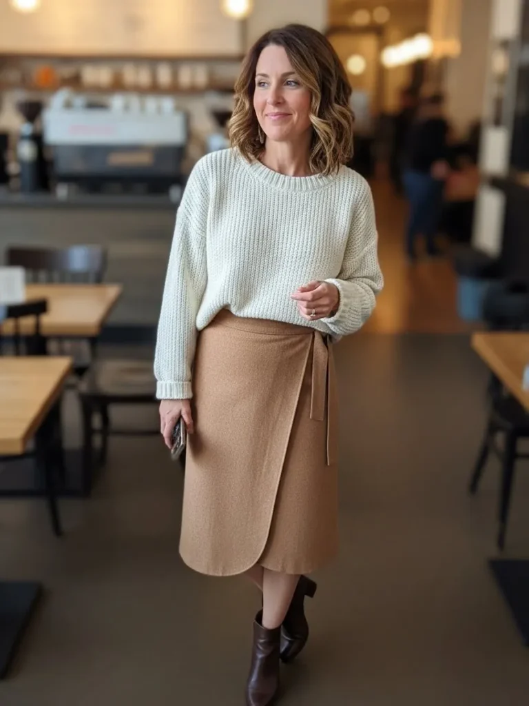 This outfit features a cozy light knit sweater paired with a neutral midi skirt that falls softly below the knee. The textures feel warm and comfortable, while the fitted top and flowing skirt create a beautiful balance. Simple ankle boots complete the look and keep everything feeling grounded and wearable.