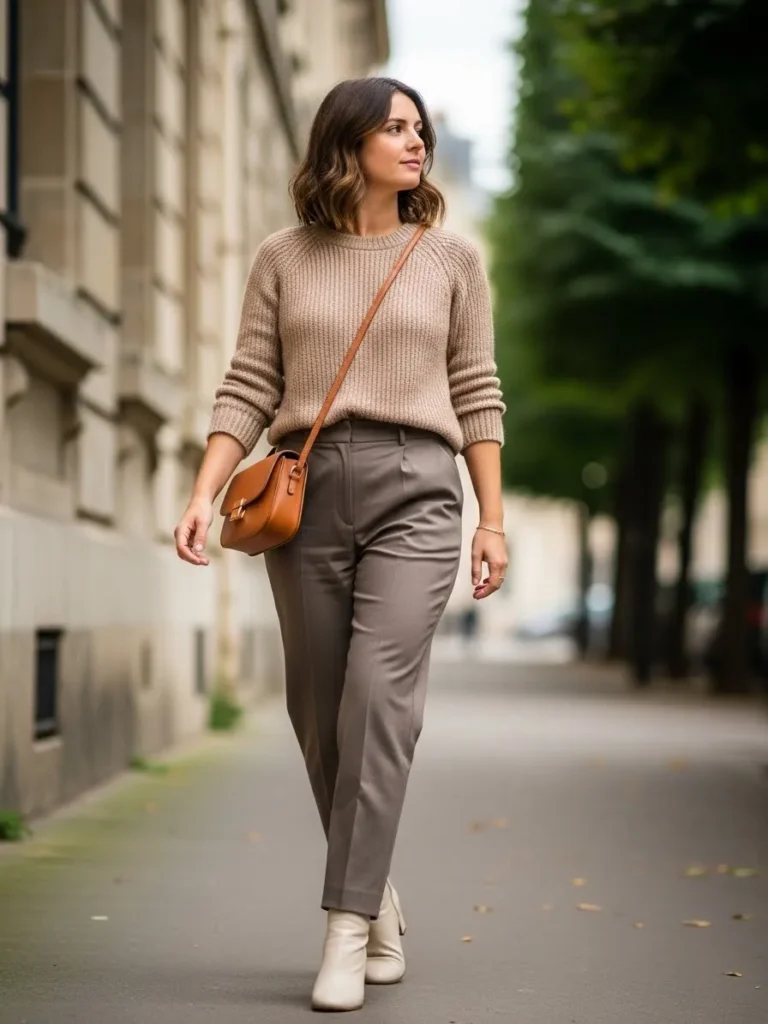 This outfit combines a warm neutral sweater with straight leg trousers in a slightly deeper tone. The fit feels easy and comfortable, styled with light shoes and a small crossbody bag that adds a casual touch. The overall vibe feels effortless and very city friendly.