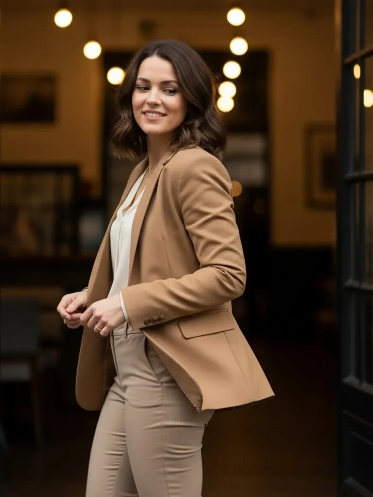 This outfit pairs a warm camel blazer with slim neutral trousers and a light top underneath. The blazer adds structure, while the softer tones keep everything feeling relaxed and wearable. Styled with simple shoes and natural makeup, the look feels polished without trying too hard.