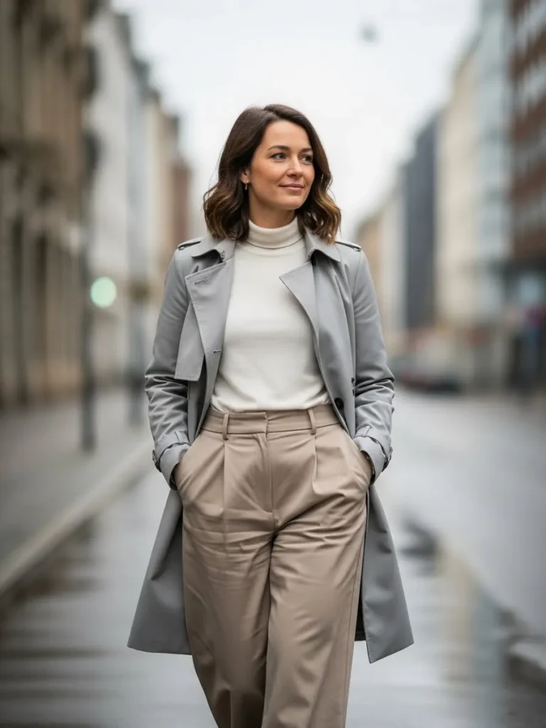 This outfit layers a light gray coat over a white knit top and beige tailored trousers. The coat adds a polished outer layer while the soft knits underneath keep the look approachable. Everything flows together in a clean, neutral color story.