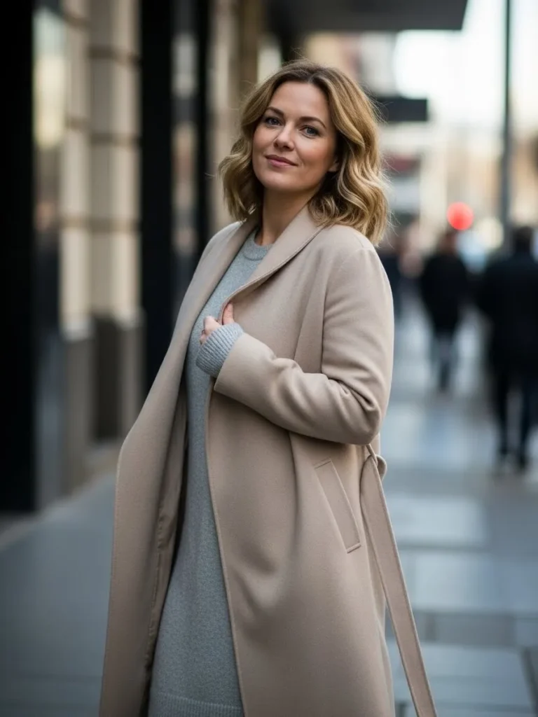 This look features a long neutral coat layered over soft knit pieces in similar tones. The silhouette feels elegant and elongating, while the textures keep it warm and wearable. Simple styling and minimal accessories keep the focus on the clean lines.