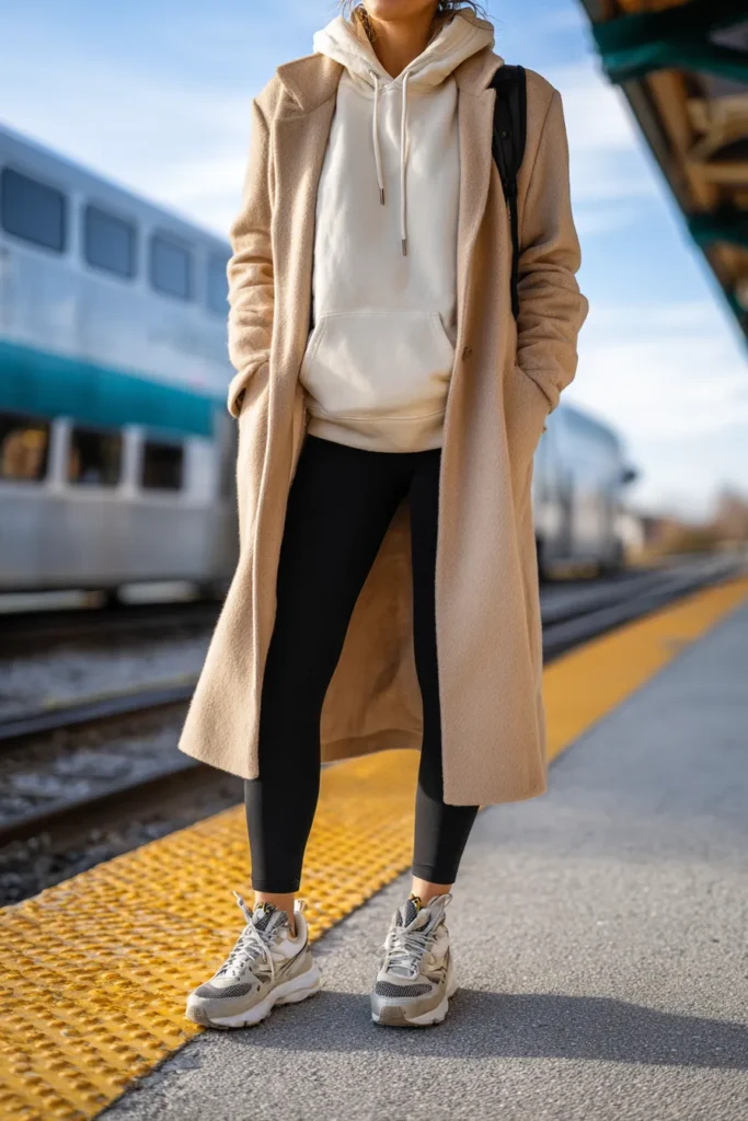 This outfit is the perfect mix of comfort and modern style. The woman is wearing a long camel coat layered over a cream hoodie, paired with sleek black leggings and chunky neutral-toned sneakers. The cozy textures and neutral colors make it look polished without trying too hard. The overall vibe feels casual yet sophisticated, ideal for catching a train or exploring a new city in chilly weather.