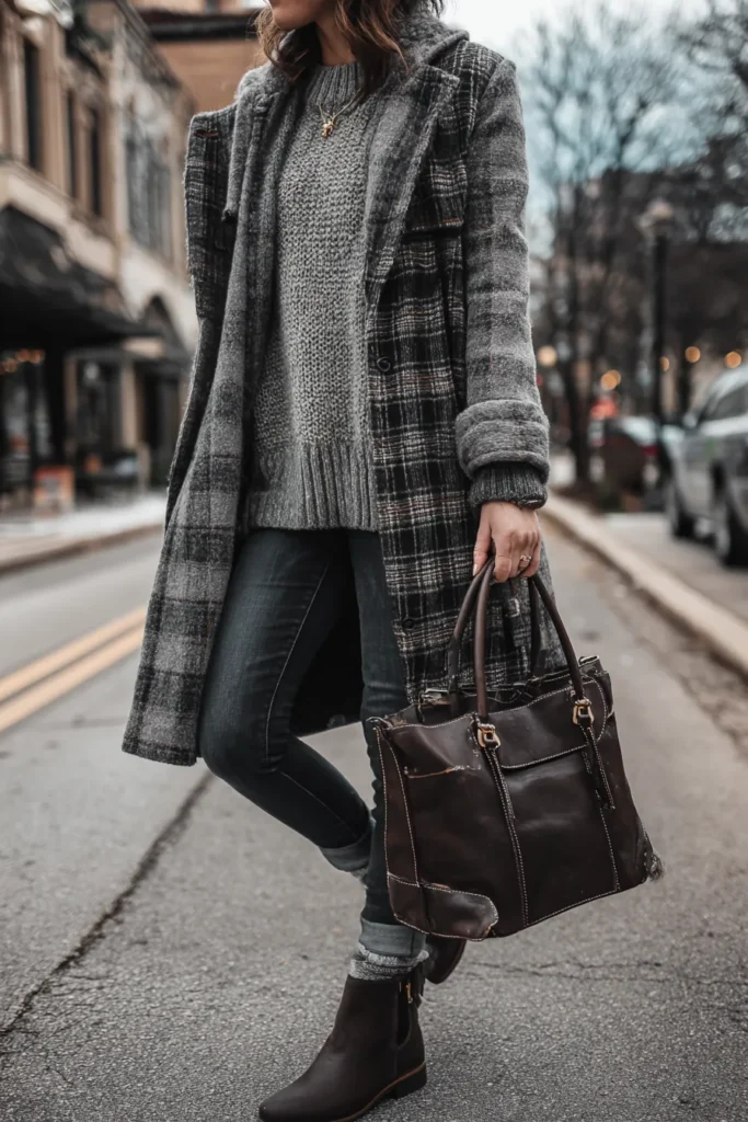 This outfit nails that laid-back winter travel energy. The woman is wearing a chunky gray knit sweater layered under a long plaid coat in muted shades of charcoal and taupe. The mix of textures feels soft and warm without looking bulky. Dark-wash skinny jeans and ankle boots give it shape, while the structured brown leather tote adds a polished finish. The overall look feels cozy but still pulled together, perfect for exploring a new city.