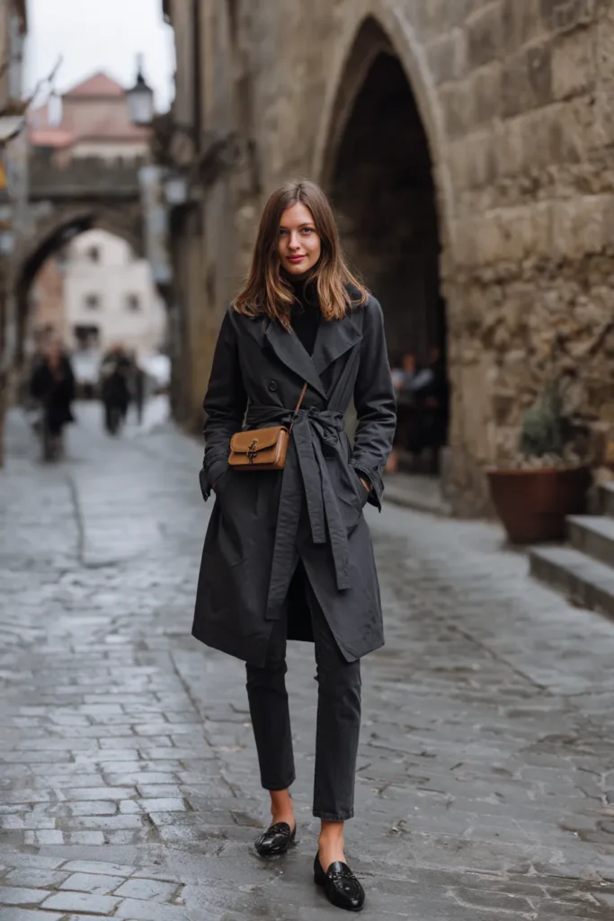 This outfit gives off major sophisticated-traveler energy. The woman is wearing a classic black belted trench coat layered over matching trousers and a simple black turtleneck. The structured coat defines her waist beautifully while the sleek loafers and tan crossbody bag add a soft contrast to the monochrome base. The entire look feels polished, minimal, and oh-so-European, perfect for wandering cobblestone streets or stopping for coffee at a corner café.