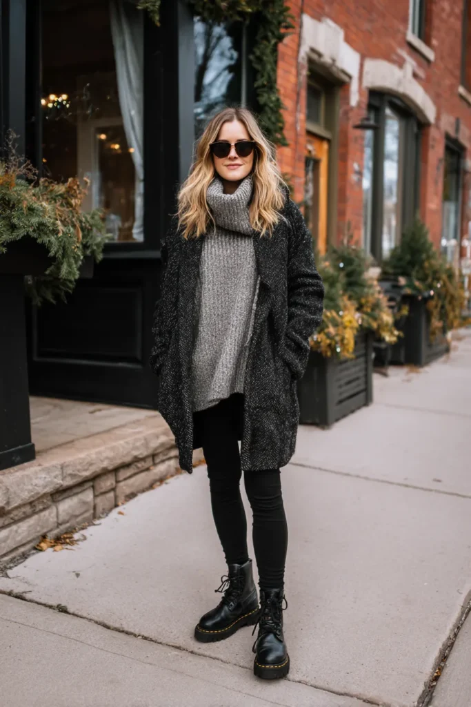 I’m obsessed with how this outfit feels so warm yet stylish at the same time. It’s practical enough for chilly streets but still fashion-forward thanks to those chunky boots and the cozy turtleneck. The tonal gray and black palette gives it that sleek, city-travel aesthetic I love. Honestly, it’s the kind of look that makes staying bundled up feel like a fashion statement instead of a necessity.