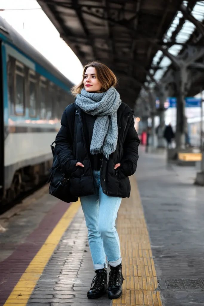 This outfit nails that laid-back winter travel vibe. The woman is wearing a black puffer jacket with a chunky gray knit scarf wrapped around her neck, light wash jeans, and shiny black combat boots. The combo feels warm, easy, and perfectly put together for hopping on a train or strolling through a chilly city. The textures of the scarf and jacket add a cozy contrast to the casual denim, creating a look that feels relaxed yet intentional.