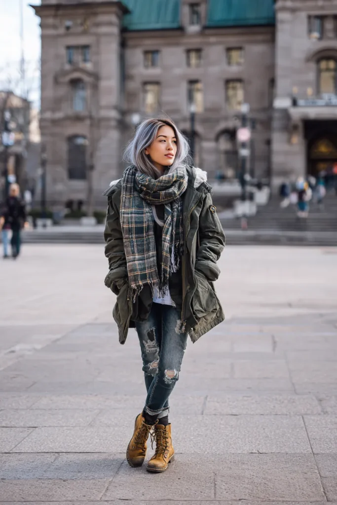 This outfit has that cozy, traveler-on-the-go energy that just works anywhere. The woman is wearing an oversized olive parka with a furry hood, layered over a white tee and paired with distressed skinny jeans. Her chunky plaid scarf pulls everything together with earthy tones, while the tan lace-up boots add a touch of adventure. The look feels relaxed, practical, and stylish in that “effortlessly cool” kind of way.