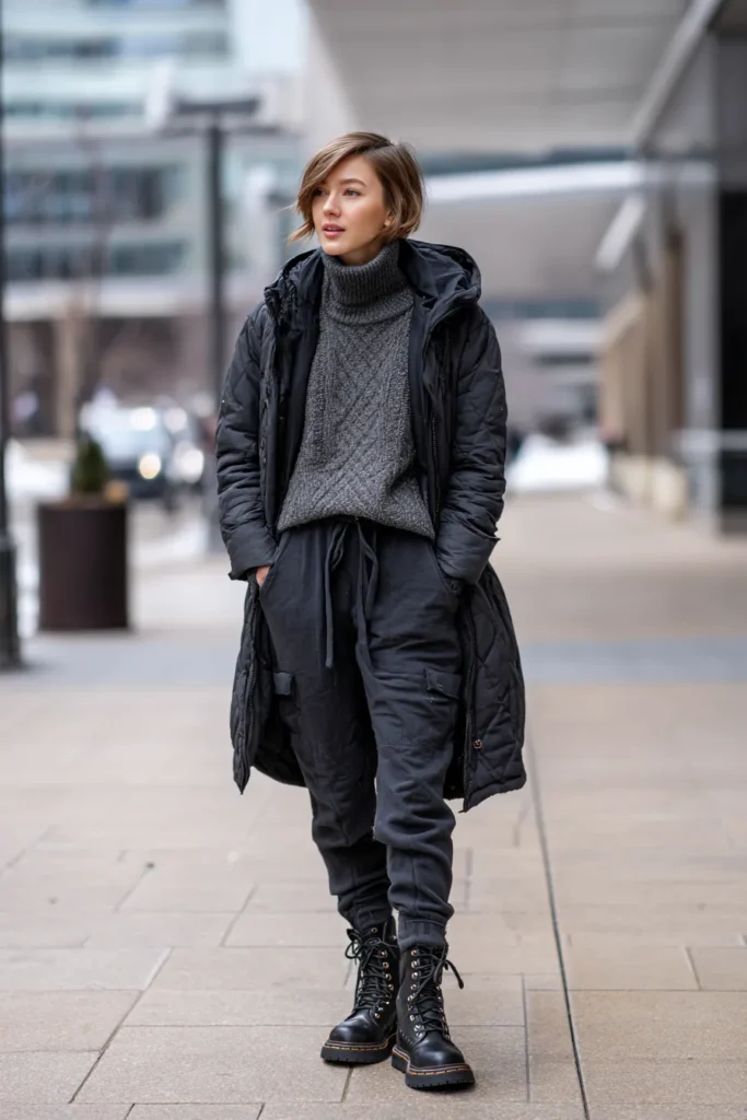 This outfit is the perfect mix of cozy and edgy. The woman is wearing a long quilted black coat layered over a chunky gray turtleneck sweater and paired with relaxed cargo-style joggers. The thick combat boots add structure and give the look a cool, confident feel. The whole vibe is effortlessly urban with just enough texture and layering to make it stand out while still being super functional for cold weather travel.