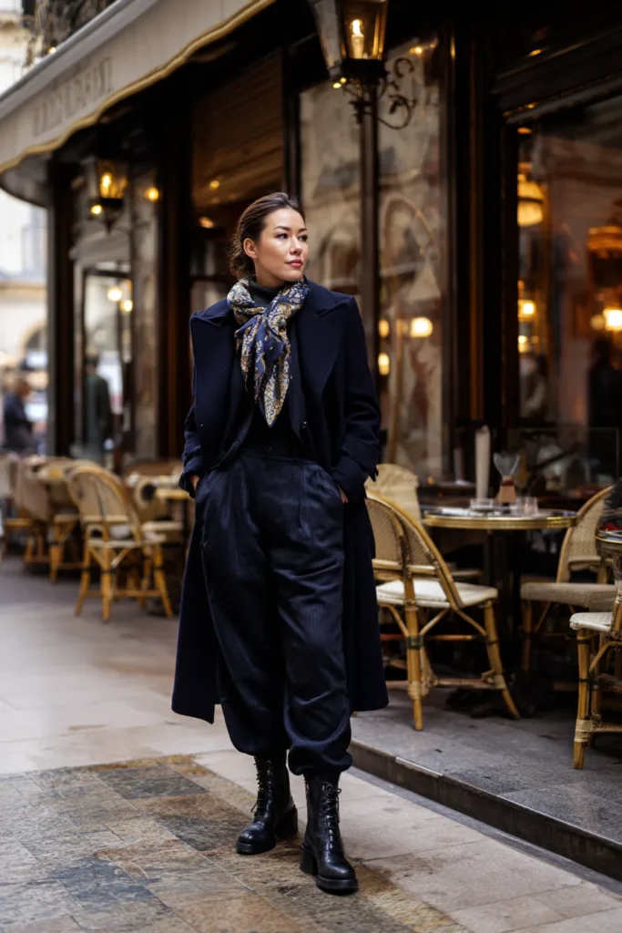 This outfit has that timeless European charm that always looks chic. The woman is wearing a long navy coat layered over dark tailored trousers and a matching turtleneck. A printed silk scarf tied effortlessly around her neck adds a pop of pattern and polish, while sleek black lace-up boots ground the look with confidence. The mix of structured pieces and soft textures gives it that refined, travel-ready edge that feels both smart and stylish.