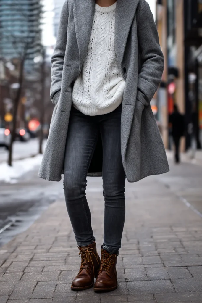 This outfit is simple, timeless, and completely travel-proof. The woman is wearing a soft gray wool coat layered over a chunky white cable-knit sweater that looks like it was made for cozy winter days. Paired with fitted gray jeans and brown lace-up boots, the look balances casual comfort with a polished edge. The muted palette and textures make it perfect for cold-weather strolls through city streets.