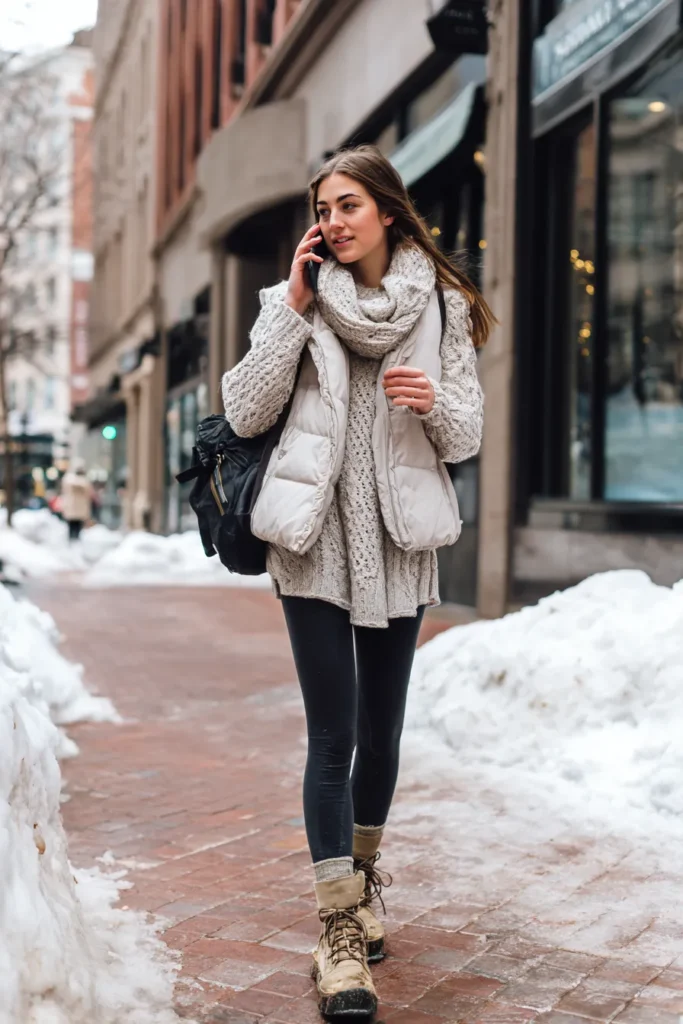 This cozy outfit is the definition of cute and practical winter style. The woman is wearing a cream chunky knit sweater layered under a soft white puffer vest, paired with black leggings and tan winter boots. A matching oversized scarf wraps around her neck, adding warmth and texture, while her casual backpack keeps it travel-ready. The overall look feels soft, neutral, and effortlessly put together.
