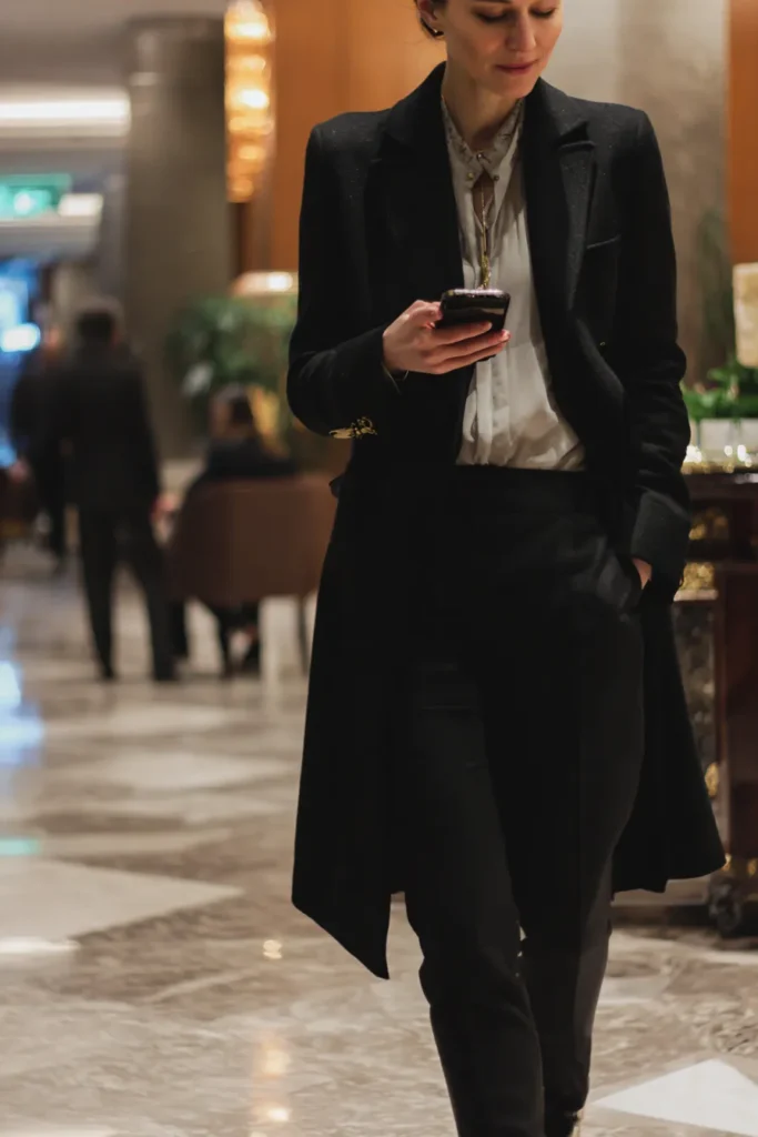 This outfit brings elegance to winter travel in the most effortless way. The woman is wearing a fitted black blazer paired with sleek black trousers and a crisp white blouse. Subtle gold details peek through from her jewelry, adding just the right touch of sophistication. The overall look feels timeless and elevated, perfect for someone who wants to move through airports or hotel lobbies looking polished but still comfortable.