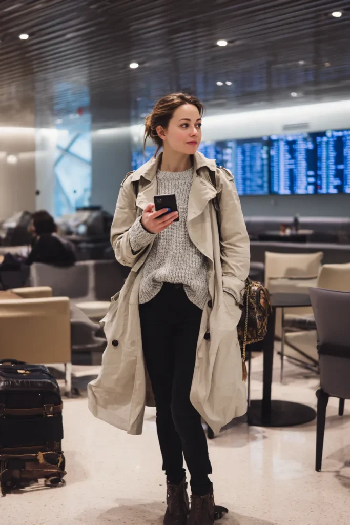 I love this look because it feels both practical and put together. The trench adds instant polish without trying too hard, and the knit sweater keeps things cozy for long flights or chilly layovers. It’s the kind of outfit that makes you feel confident the moment you step out the door, no matter what’s waiting at your destination.
