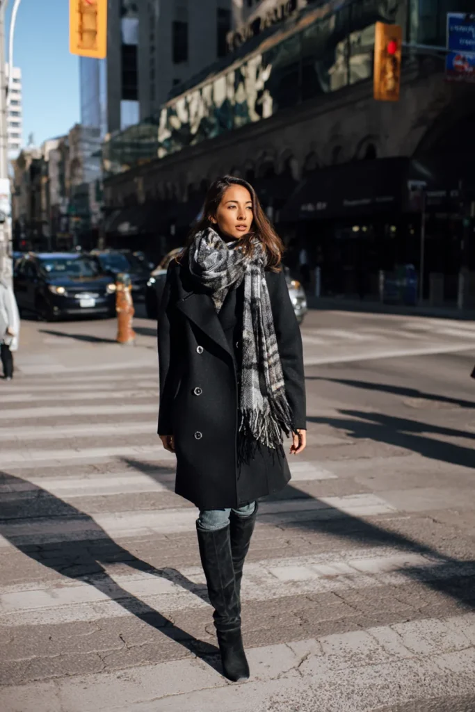 This outfit is a masterclass in polished winter style with just the right amount of edge. The woman is wearing a sleek black double-breasted coat over fitted jeans and tall suede boots that instantly elongate her silhouette. Her oversized gray plaid scarf adds texture and warmth, effortlessly draped around her neck for that relaxed yet refined look. The city backdrop, golden sunlight, and confident stride make this moment feel straight out of a street-style photo shoot.