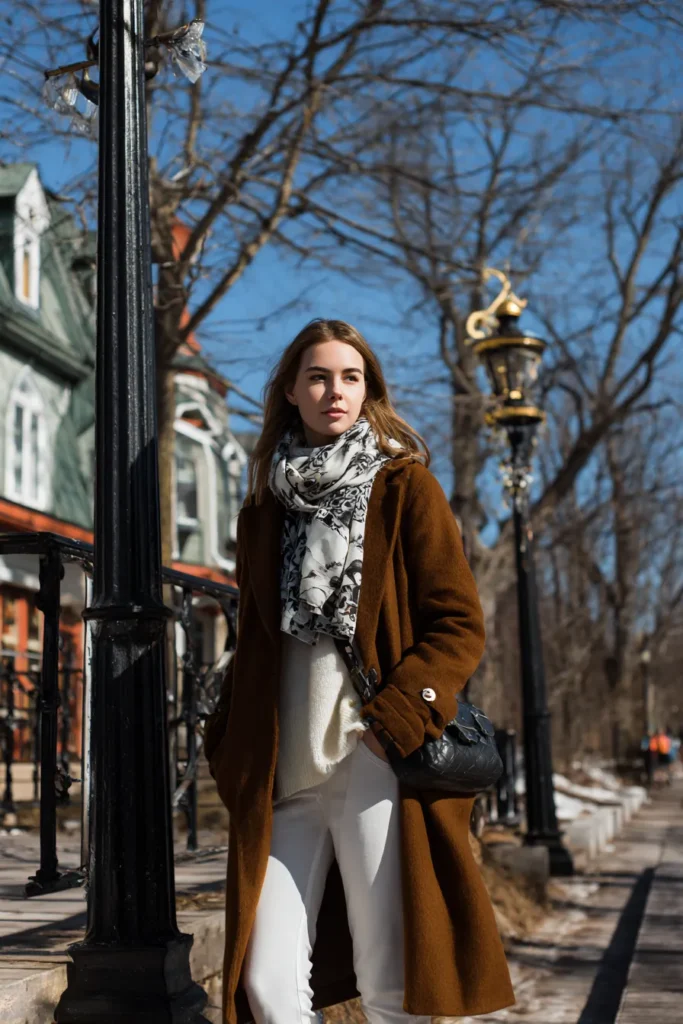 This outfit is the perfect mix of classic and modern winter style. The woman is wearing a rich brown wool coat layered over a cream sweater and crisp white pants, creating a warm yet refreshing color balance. Her black-and-white printed scarf adds a playful twist, breaking up the neutrals with a subtle artistic flair. The crossbody bag and sunlit street background make it feel effortlessly city-chic and ready for a day of exploring or brunching outdoors.