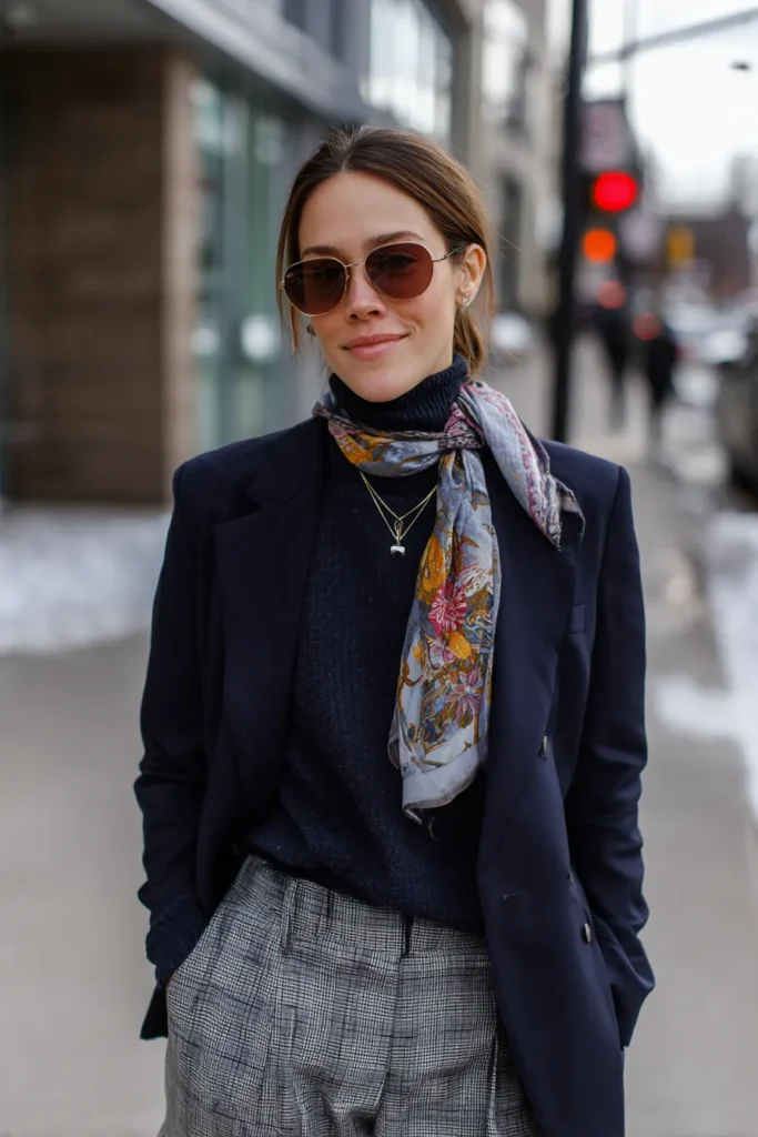 This look is the perfect blend of sophistication and softness. The woman wears a navy turtleneck paired with a structured blazer and tailored plaid trousers, giving off major city-girl confidence. What makes the outfit truly special is the delicate floral scarf tied neatly around her neck—it adds just the right touch of color and femininity to balance the sharp tailoring. The gold layered necklaces and round sunglasses elevate the outfit with subtle polish.