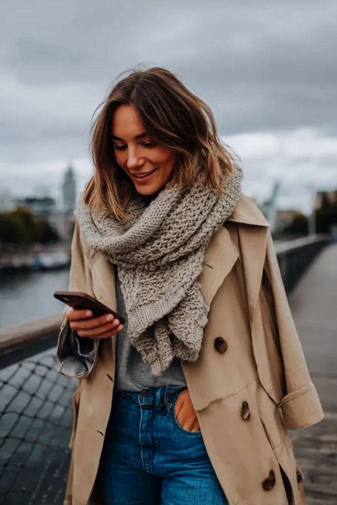 This look nails that timeless, easy-going city style we all love for winter. The woman is wearing a beige trench coat layered over a soft gray sweater, paired with classic blue jeans for a relaxed yet polished vibe. Her chunky knit beige scarf adds warmth and texture, making the outfit feel perfectly cozy without being bulky. The muted tones blend beautifully together, giving off a soft, minimalistic aesthetic that’s both modern and versatile.