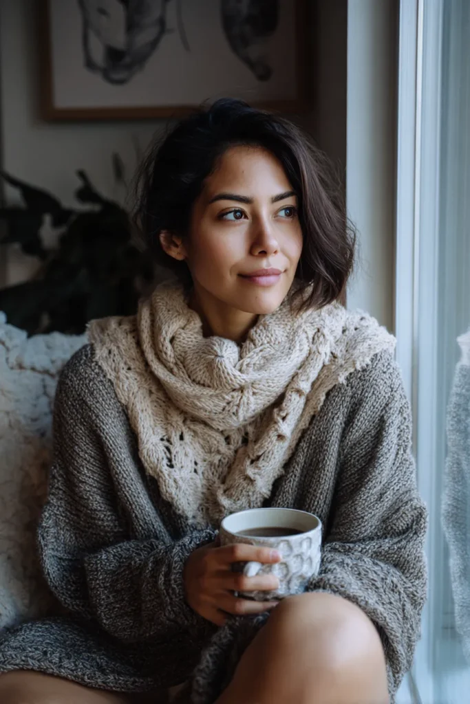 This serene look features a woman wrapped in layers of cozy knits — a chunky oatmeal-colored scarf draped softly over a loose, textured gray sweater. The combination of warm neutrals creates a calming and effortless feel, perfect for slow mornings at home. With a mug of coffee in hand and natural light streaming in, the entire scene radiates peaceful comfort and understated elegance.