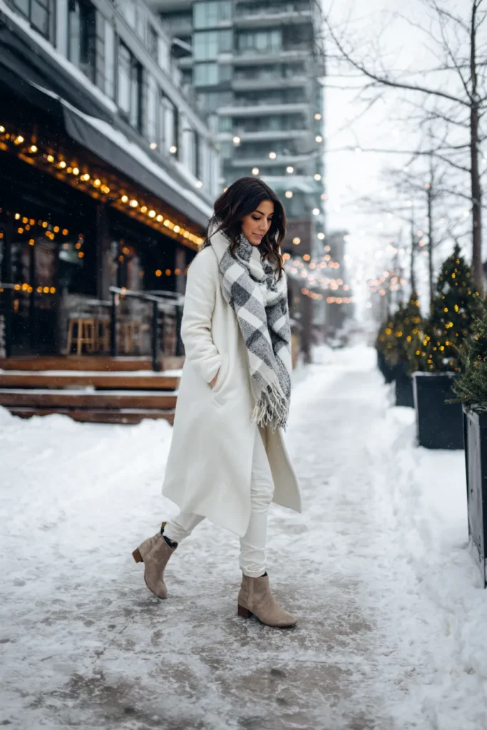 This outfit is pure winter elegance from head to toe. The woman is wearing a long white wool coat over matching cream pants and a cozy sweater, creating a monochrome base that feels soft and sophisticated. Her oversized gray-and-white checked scarf adds just the right amount of pattern and texture, making the whole look pop against the snowy backdrop. The taupe ankle boots tie it all together perfectly, balancing warmth with effortless polish.