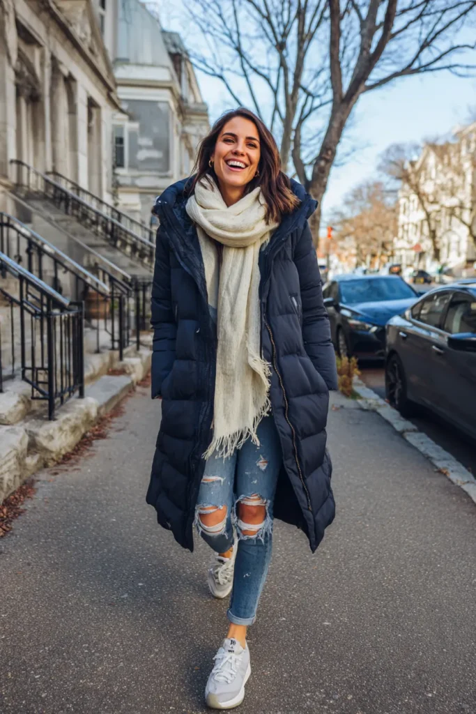 This outfit nails that casual-chic winter look we all love. She’s wearing a long navy puffer coat over a simple top, paired with distressed skinny jeans and white sneakers that give the outfit a fun, easygoing vibe. The soft cream scarf is the highlight—loosely wrapped around her neck, it adds warmth and texture without feeling bulky. The mix of neutrals and denim keeps everything effortlessly balanced while her bright smile makes it even cozier.