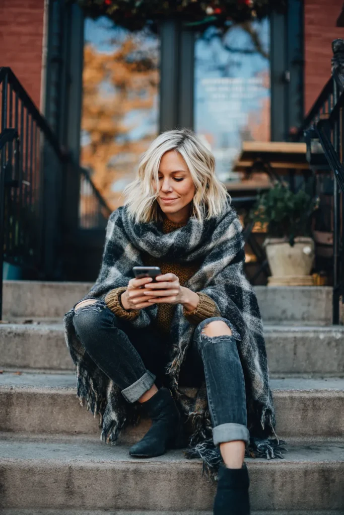 This outfit has that perfectly effortless, laid-back vibe that makes winter dressing feel fun instead of fussy. The woman is wearing a chunky brown knit sweater paired with distressed black jeans and ankle boots. Draped around her shoulders is a large plaid blanket scarf in muted tones of gray and cream, giving her that cozy, wrapped-up look that feels as comfortable as it looks stylish. Sitting on outdoor steps with a casual smile and tousled blonde waves, the whole moment feels warm and down-to-earth.