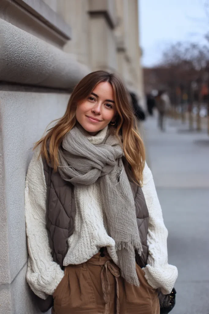 This outfit is a cozy mix of soft textures and warm earthy tones that feel perfectly balanced for winter days. The woman is wearing a chunky cream knit sweater tucked into high-waisted caramel trousers, topped with a light brown quilted vest for extra warmth. A taupe scarf is loosely wrapped around her neck, adding that final touch of comfort while keeping the palette calm and coordinated. The combination of knits and cotton creates a look that’s both relaxed and polished without feeling overdone.