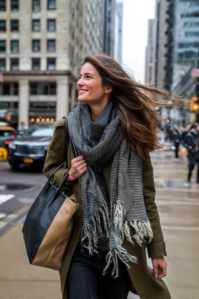 This outfit gives off major “confident city girl” energy in the best possible way. The woman is wearing an olive green coat layered over dark jeans and a soft charcoal top, paired with a large black-and-white striped scarf that’s casually draped around her neck. The fringe details and oversized texture of the scarf make it the perfect statement piece while keeping her warm against the chill. Her neutral tote bag ties everything together and adds that polished everyday touch.
