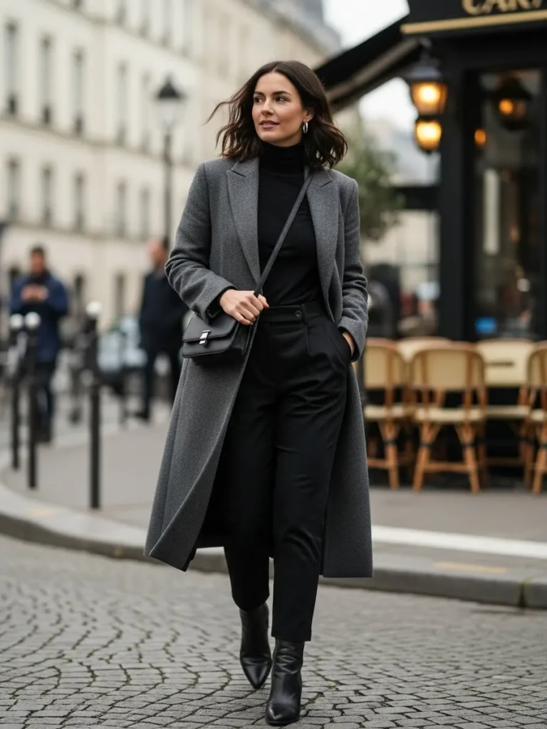 This look centers around a long gray tailored coat worn over an all black base with a fitted top and structured trousers. Black ankle boots and a small crossbody bag keep everything streamlined and modern. The clean lines and neutral palette make the outfit feel timeless yet very current.
