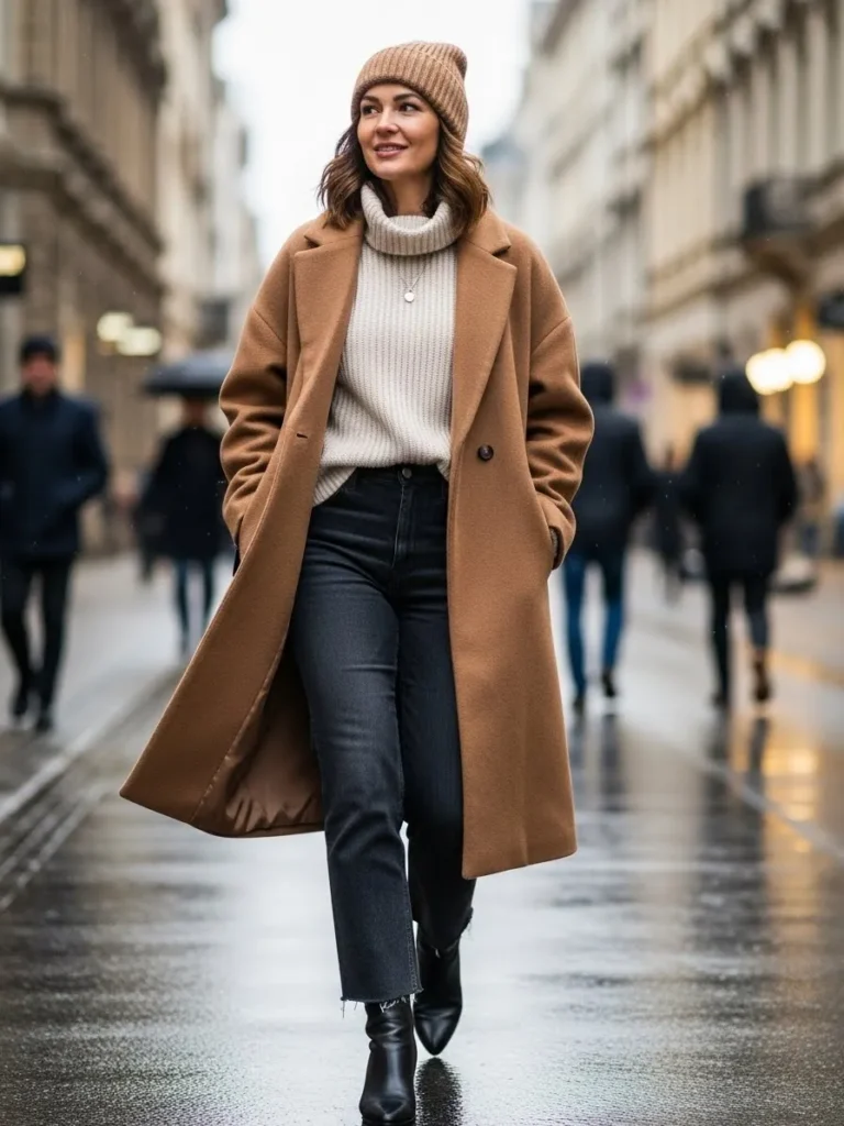 This look features a camel coat layered over a chunky cream turtleneck sweater, paired with dark denim jeans and black ankle boots. The warm tones make the outfit feel cozy, while the clean silhouette keeps it modern. It is simple but very flattering.