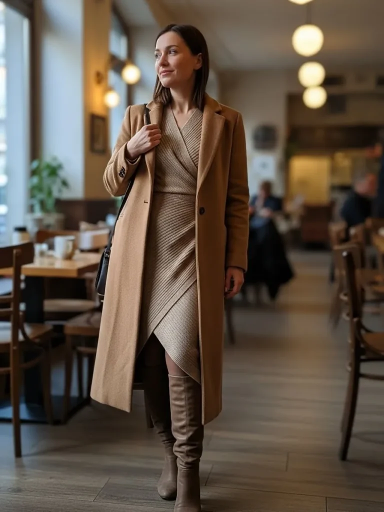 Here we see a camel coat layered over a beige wrap style knit dress that hugs the body without feeling tight. Knee high boots in a similar neutral tone elongate the silhouette, while the warm café setting adds to the cozy atmosphere. The textures feel soft and refined at the same time.