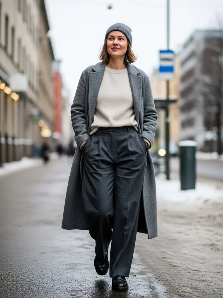 This outfit combines a long gray coat with a simple cream knit sweater and tailored gray trousers. A gray beanie and black loafers finish the look, keeping it clean and classic. The neutral palette makes everything feel calm and timeless.