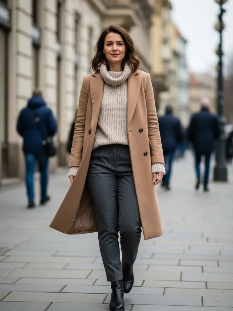 This outfit pairs a camel coat with a textured beige knit sweater and tailored gray trousers. Black ankle boots add structure, while the soft colors keep everything balanced. The overall look feels refined but still very wearable.