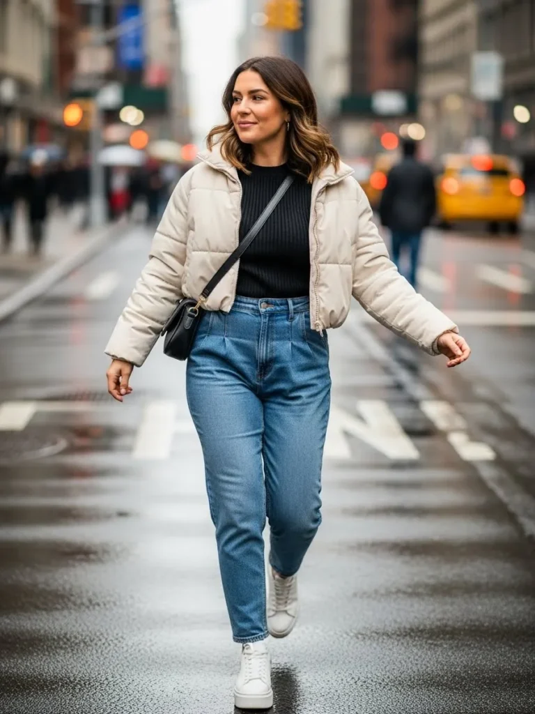 This outfit pairs a light neutral puffer jacket with a black ribbed sweater and classic blue jeans. White sneakers keep things casual and comfortable, while the crossbody bag adds a practical touch. The overall look feels relaxed and very wearable for everyday errands.