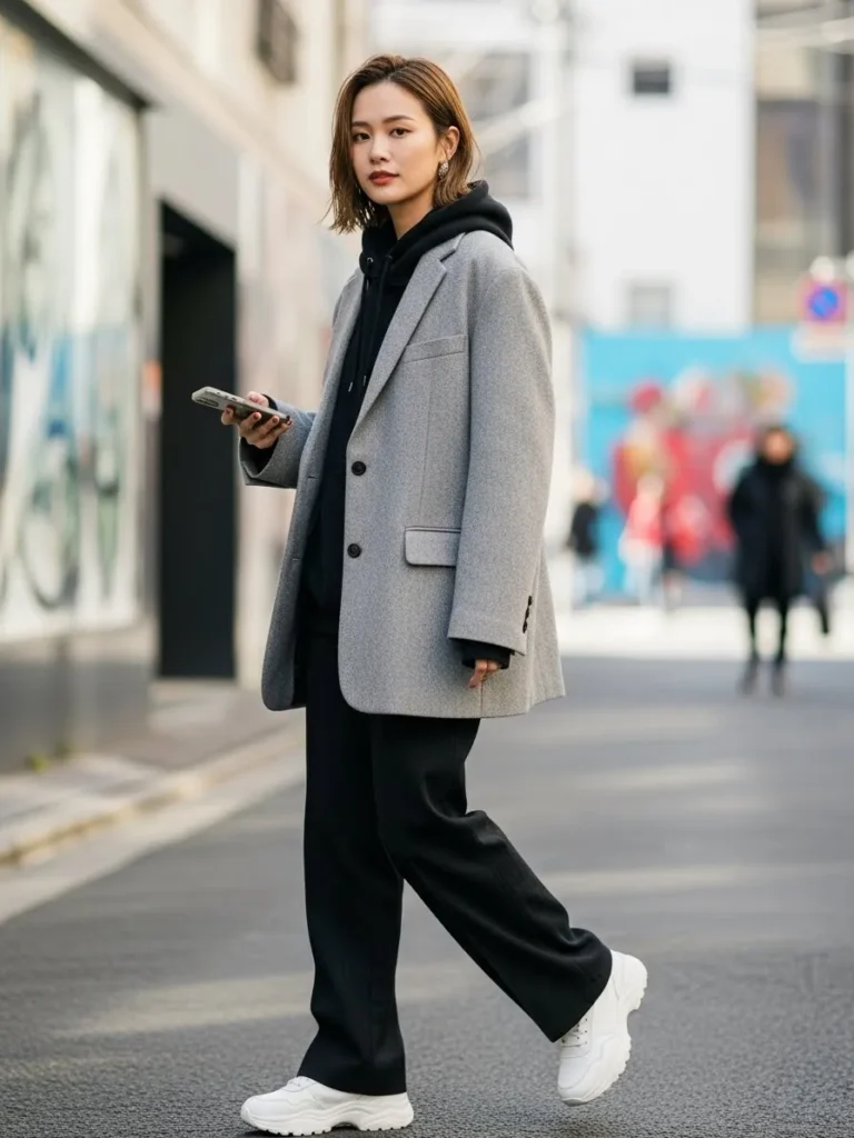 This look combines a gray oversized blazer with a black hoodie underneath, paired with loose black trousers and chunky white sneakers. The mix of tailored and casual pieces gives the outfit a cool street style feel. It looks comfortable but still intentional.