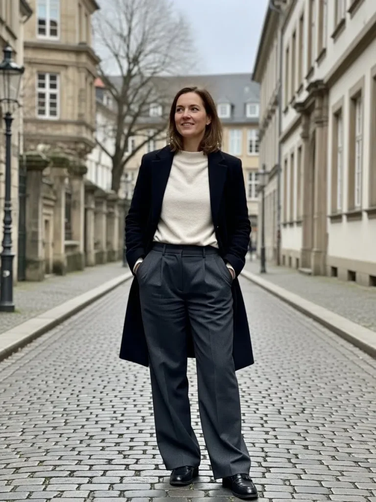 This look combines a light neutral coat with a simple knit sweater and tailored gray trousers. Black ankle boots keep the outfit grounded and classic. The overall feel is clean, timeless, and easy to wear.