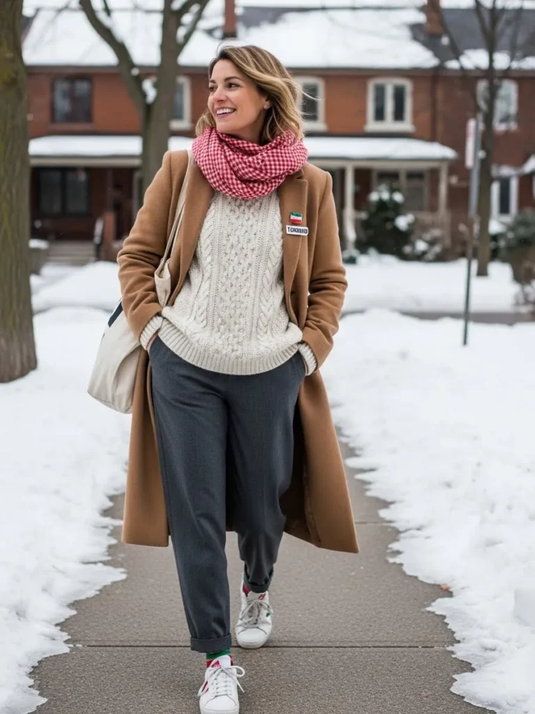 This outfit features a warm camel wool coat layered over a chunky cream cable knit sweater, paired with relaxed gray trousers that sit comfortably at the waist. A red patterned scarf adds a pop of color and texture, while classic white sneakers keep the look grounded and practical for winter walks. The canvas tote and casual styling give it an easy everyday vibe that still feels polished.