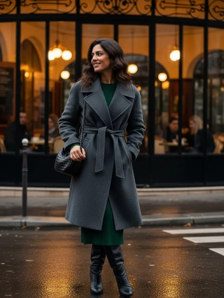 This outfit centers around a gray belted coat layered over a deep green knit dress. Knee high black boots and a textured shoulder bag add depth and elegance. The warm café lighting and soft fabrics give the whole look a cozy yet refined vibe.